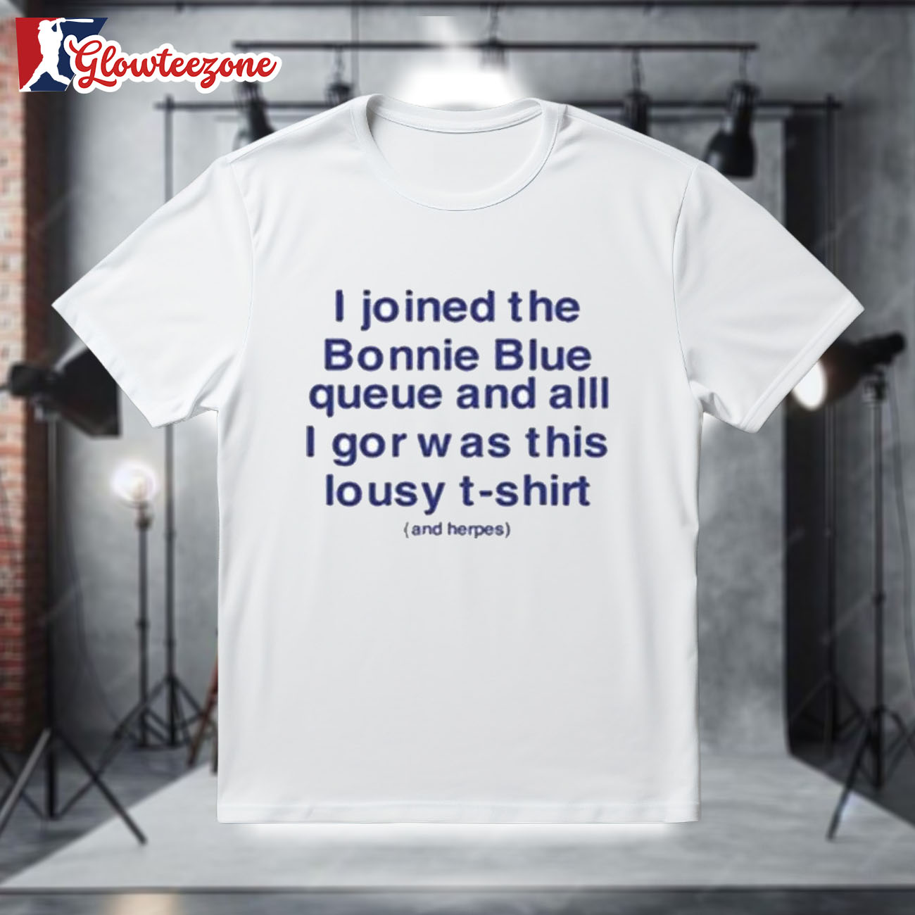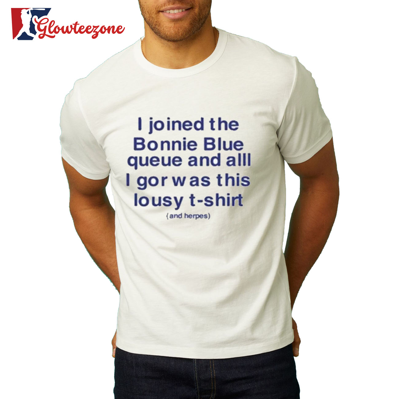 Show your belief, your pride, and your loyalty with the I Joined The Bonnie Blue Queue And All I Got Was This Lousy T-Shirt And Herpes T-shirt