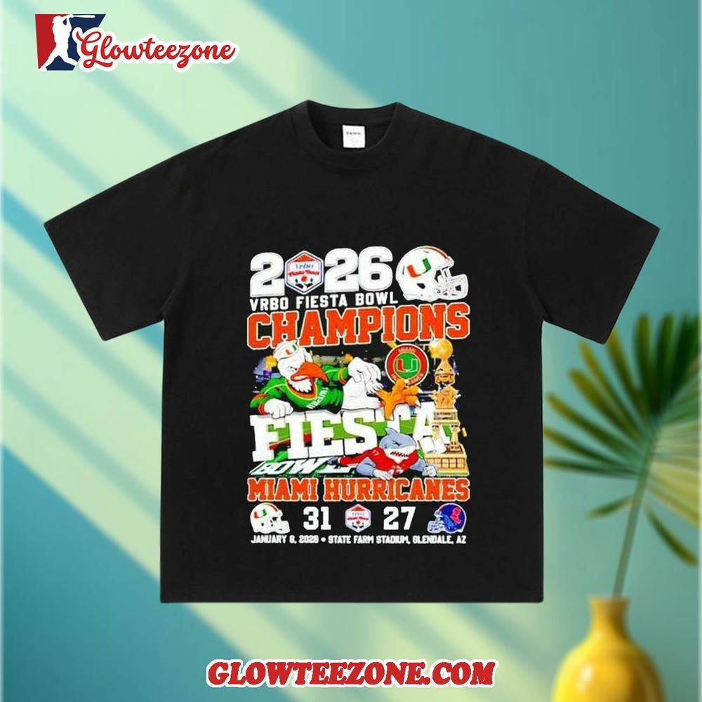 Made from a lightweight, breathable fabric blend with a soft, smooth feel, the Miami Hurricanes 2026 CFP Vrbo Fiesta Bowl Champions 31-27 score mascot Shirt is built for comfort and versatility. It’s perfect for game days, tailgate parties, casual hangouts, or everyday wear when you want to represent your team without overdoing it. The 2D design keeps the look clean and wearable, making it easy to pair with jeans, shorts, or layered outfits.