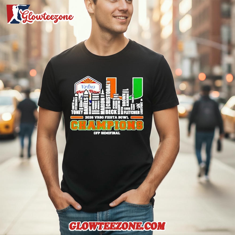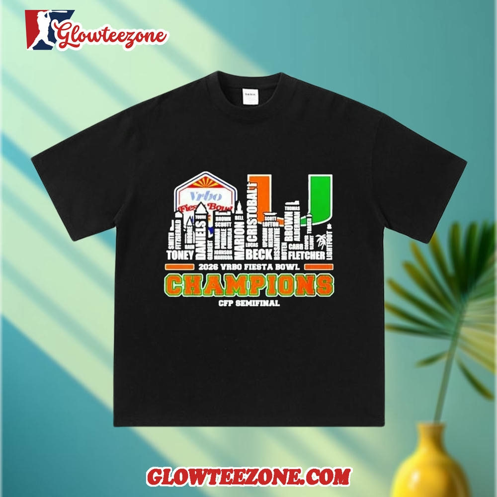 Miami Hurricanes CFP Fiesta Bowl Champions 2025-26 player name city skyline Shirt is more than just fan apparel — it’s a clean, confident expression of true team loyalty. Designed for NFL fans who appreciate timeless style with modern attitude, this 2D shirt delivers sharp, high-quality graphics that showcase your favorite team in a bold yet balanced way. Using advanced all-over sublimation printing, every detail is crisp and vibrant, with colors that stay fresh and intact wash after wash — no cracking, peeling, or fading over time.