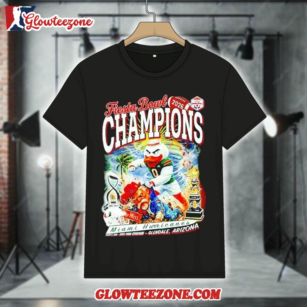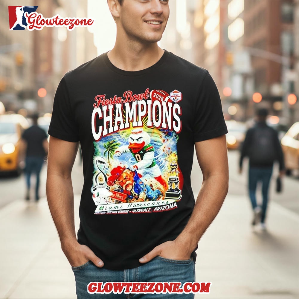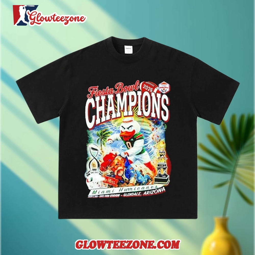 Miami Hurricanes College Football Playoff 2026 Fiesta Bowl Champions mascot vintage Shirt is more than just fan apparel — it’s a clean, confident expression of true team loyalty. Designed for NFL fans who appreciate timeless style with modern attitude, this 2D shirt delivers sharp, high-quality graphics that showcase your favorite team in a bold yet balanced way. Using advanced all-over sublimation printing, every detail is crisp and vibrant, with colors that stay fresh and intact wash after wash — no cracking, peeling, or fading over time.