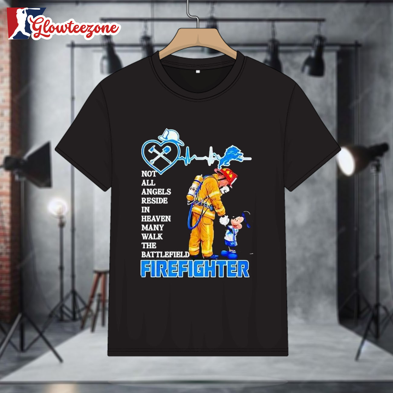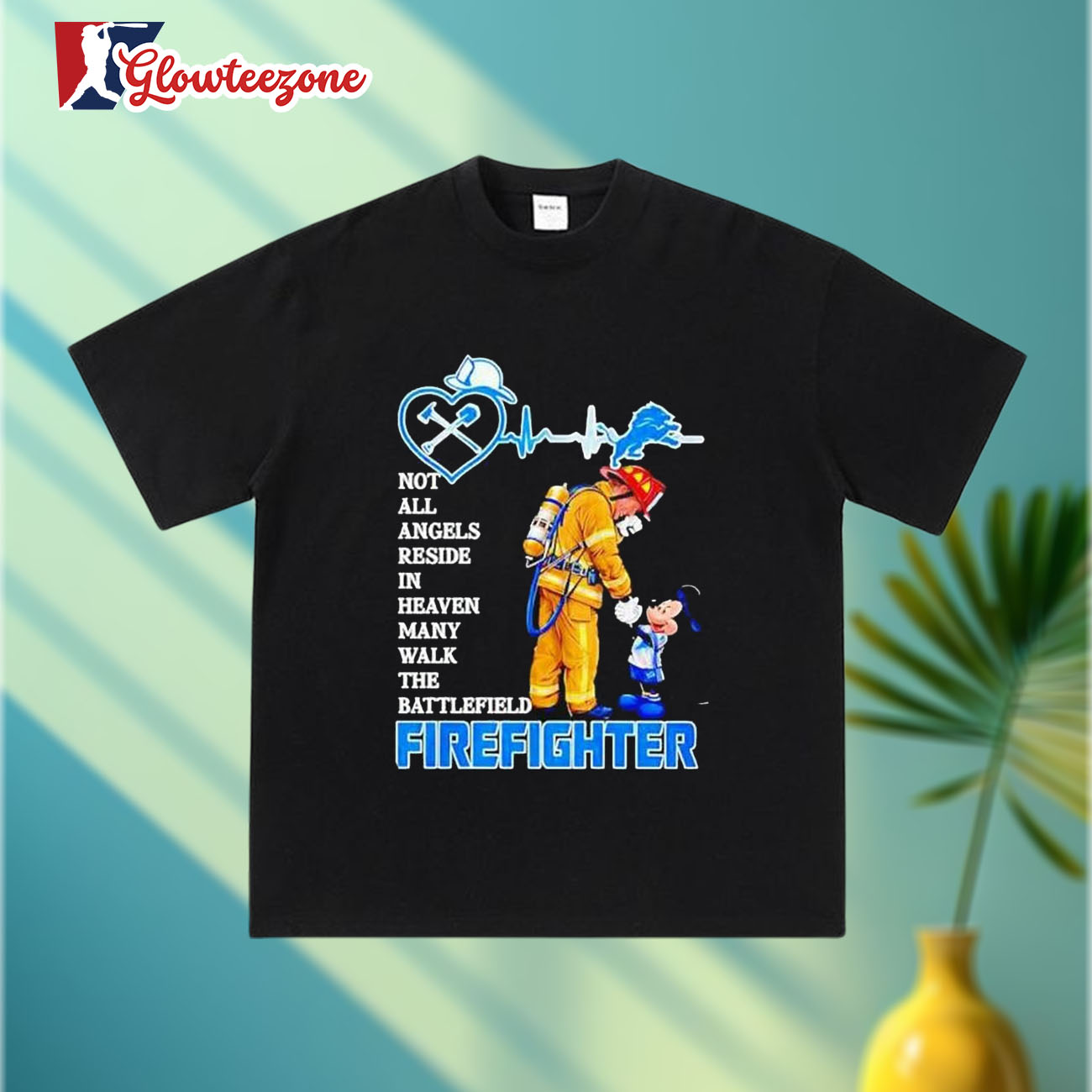 Show your belief, your pride, and your loyalty with the Mickey x Detroit Lions Not All Angels Reside In Heaven Many Walk The Battlefield Firefighter Shirt