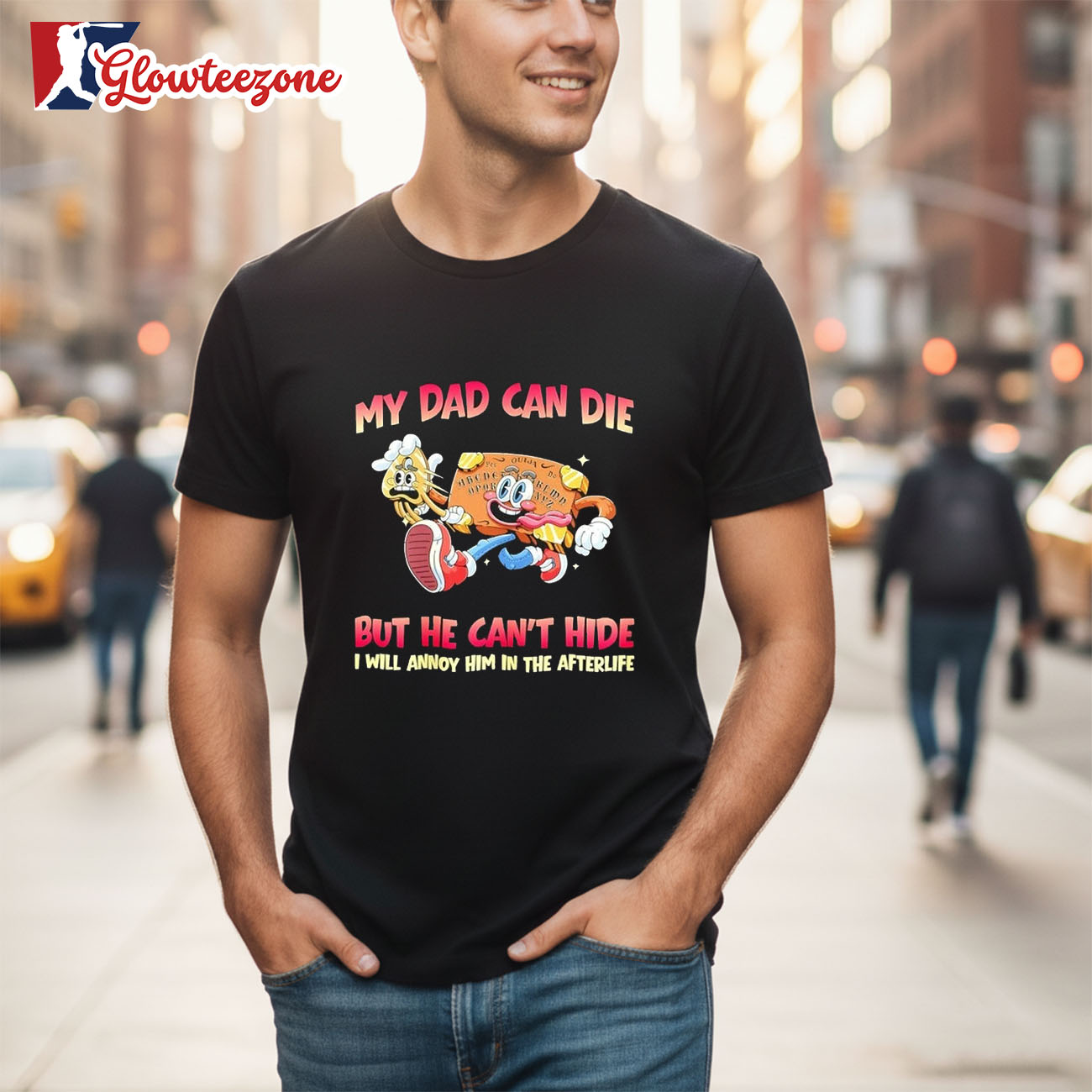 The bold My Dad Can Die But He Cant Hide I Will Annoy Him In The Afterlife Shirt design represents confidence in what’s ahead, belief in growth, and appreciation for the journey. It sparks conversation, connects like-minded fans, and reflects the energy of those who stay loyal to what they support.