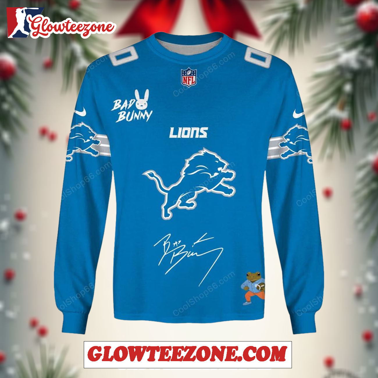Nfl Detroit Lions X Bad Bunny Super Bowl 2026 Special Edition Custom Sweatshirt is more than just fan apparel — it’s a bold statement of passion and pride. Designed exclusively for NFL supporters who love to stand out, this 3D shirt brings your favorite team’s spirit to life with eye-catching, high-definition graphics and premium craftsmanship. Each shirt is printed using advanced sublimation technology, ensuring vivid colors that never fade, crack, or peel — even after countless washes.