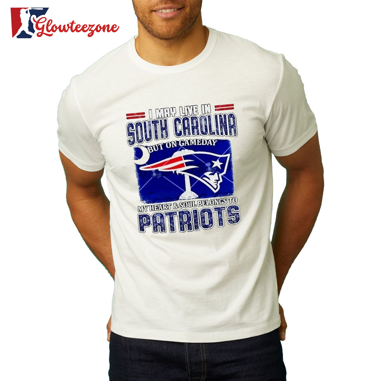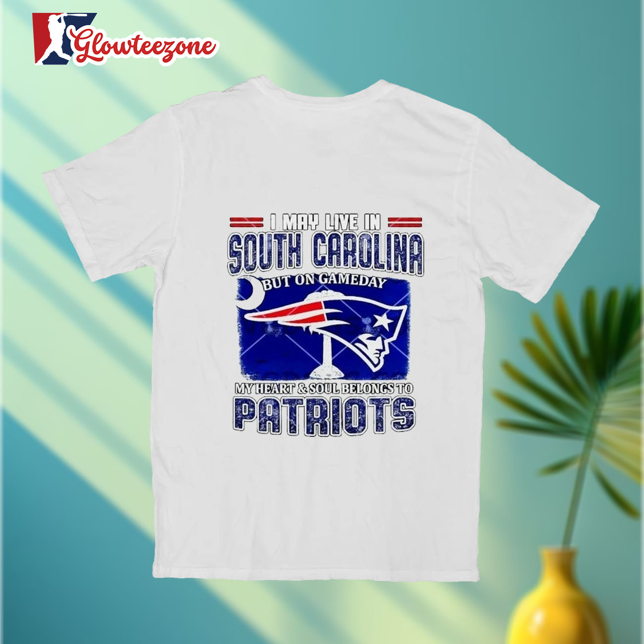 Show your belief, your pride, and your loyalty with the Original I May Live In South Carolina But On Gameday My Heart And Soul Belongs To New England Patriots T-shirt