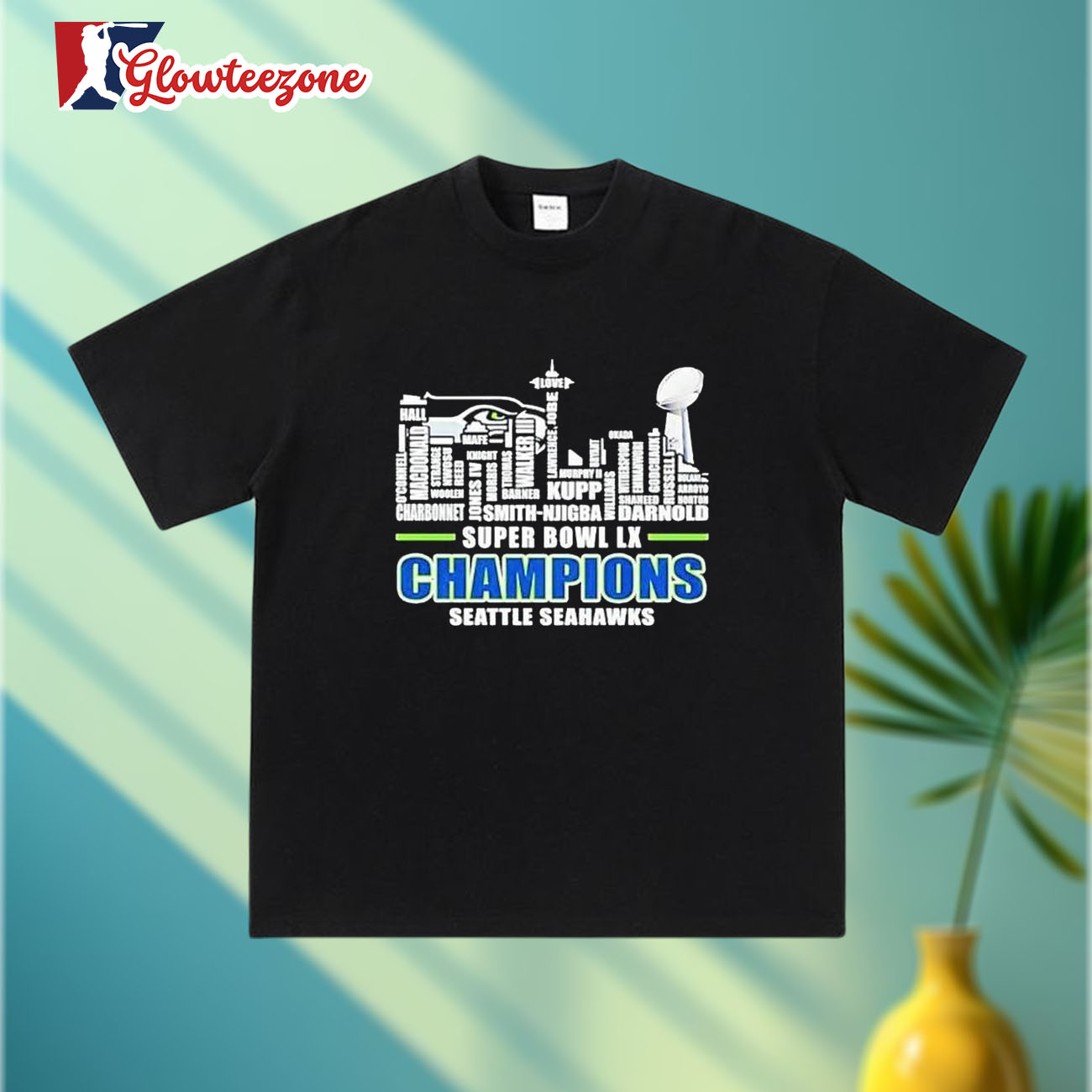 Show your belief, your pride, and your loyalty with the Seattle Seahawks Super Bowl LX Champions Players Names City Skyline Shirt