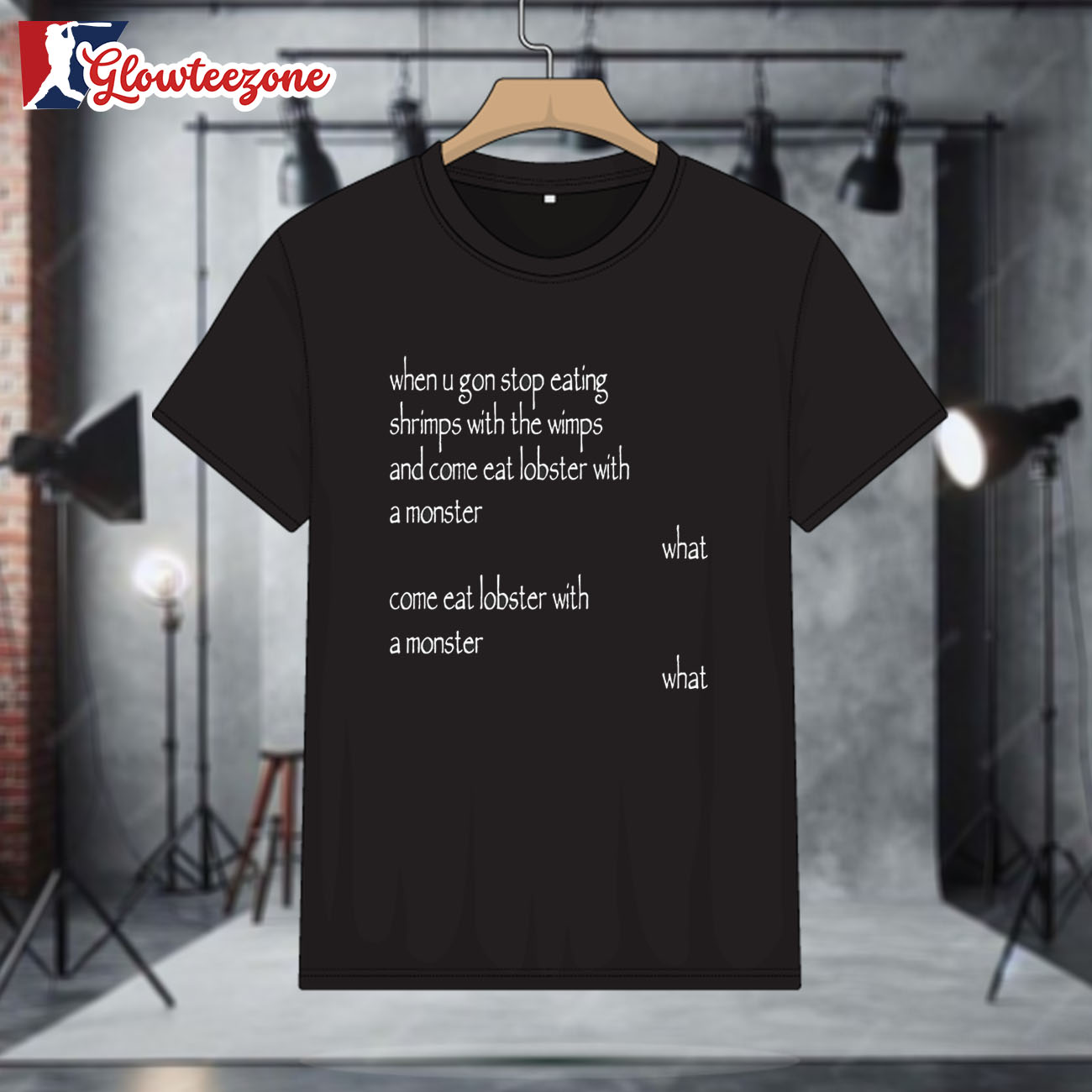 Show your belief, your pride, and your loyalty with the When U Gon Stop Eating Shrimps With The Wimps And Come Eat Lobster With A Monster Shirt