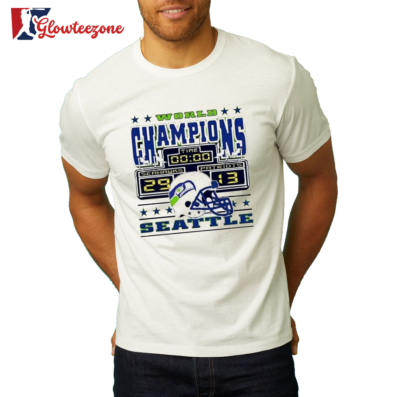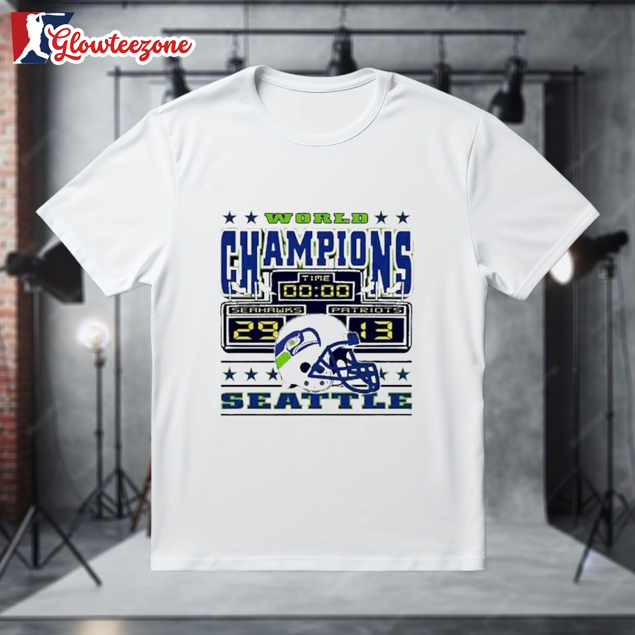 Show your belief, your pride, and your loyalty with the World Champions Seattle Seahawks 29 Patriots 13 Scoreboard Helmet Shirt